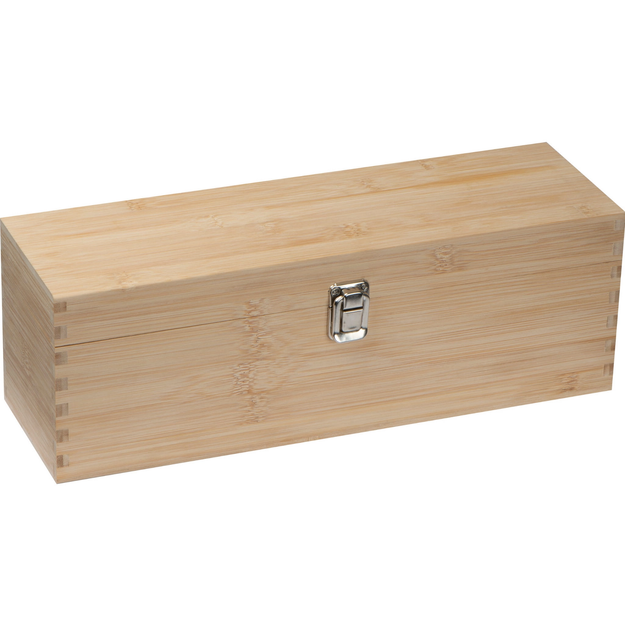 Elegancka, drewniana skrzynka na wino w której znajdziesz wszystkie najpotrzebniejsze przybory barmańskie - otwieracz do butelek, korek, nalewak i pierścień.