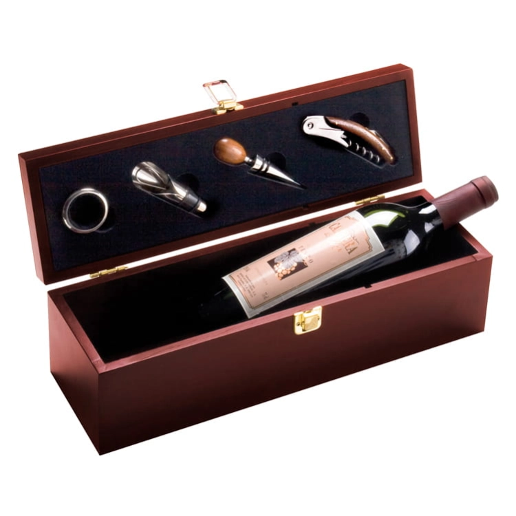 Luksusowa skrzynka na wino, wyposażona w nóż kelnerski, korek, lejek i ociekacz. Logotyp można umieścić bezpośrednio na produkcie.