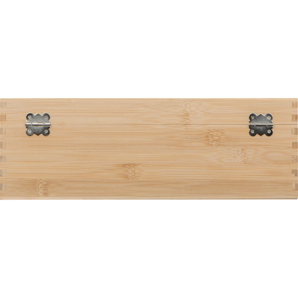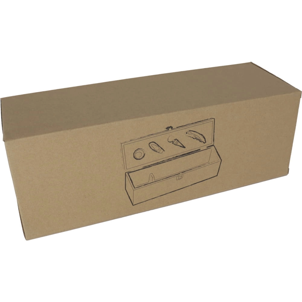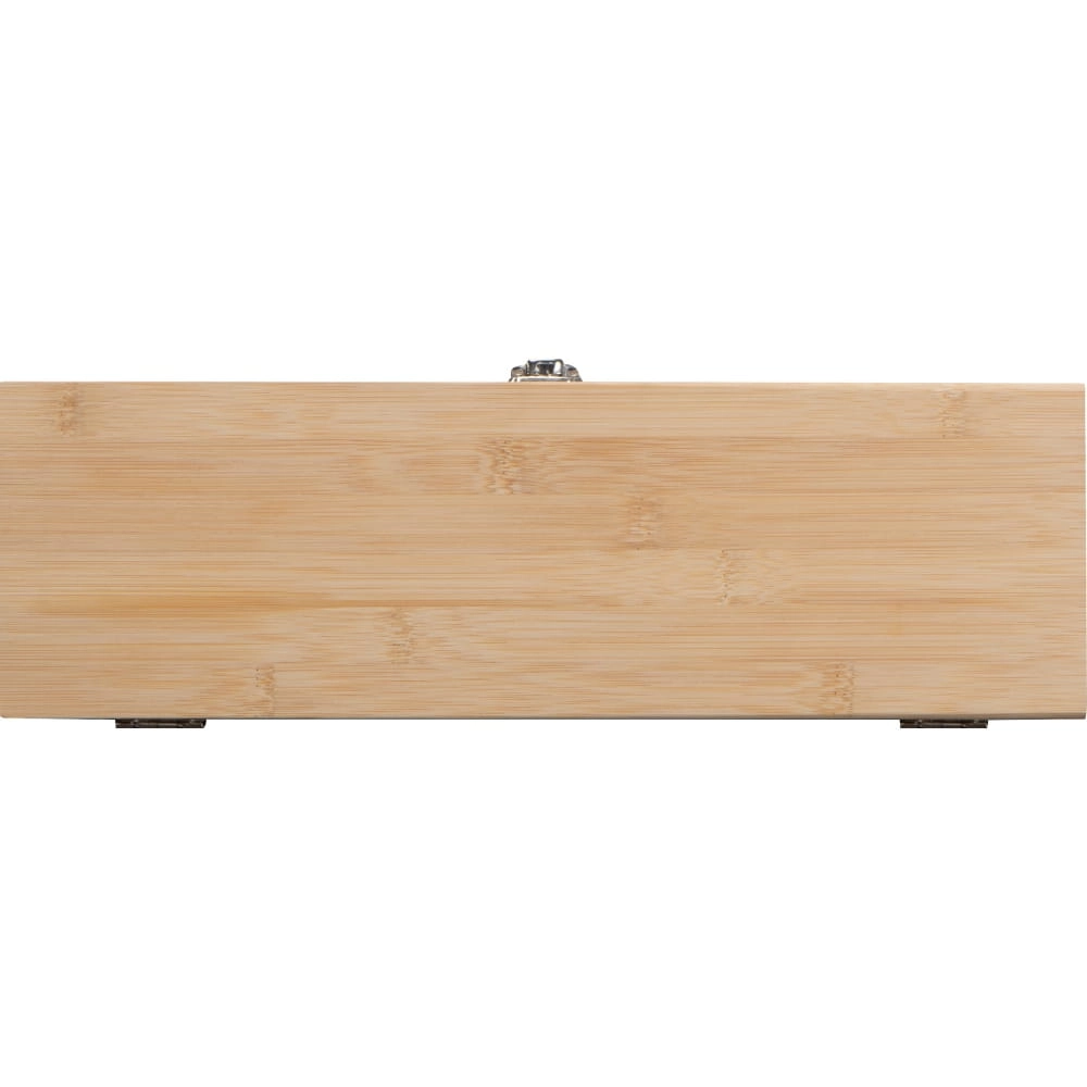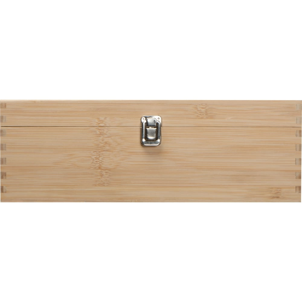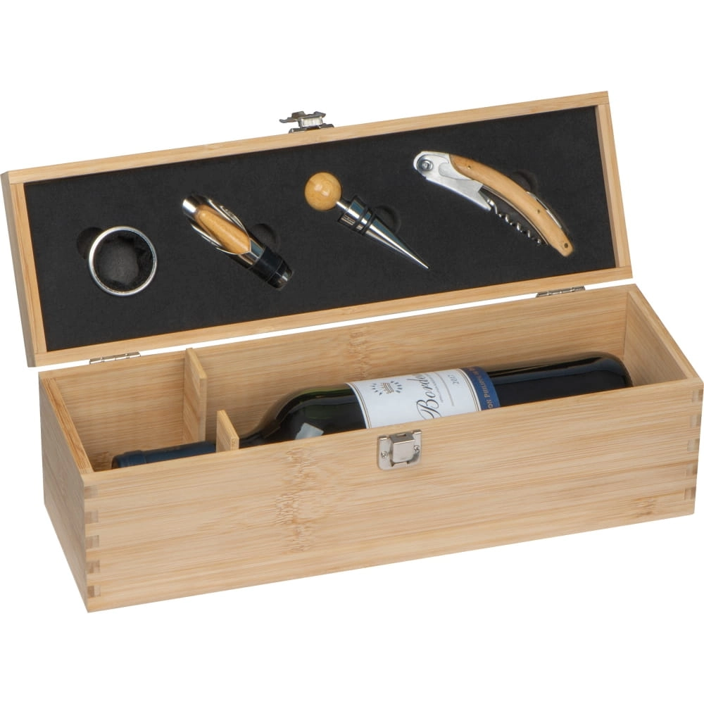Elegancka, drewniana skrzynka na wino w której znajdziesz wszystkie najpotrzebniejsze przybory barmańskie - otwieracz do butelek, korek, nalewak i pierścień.
