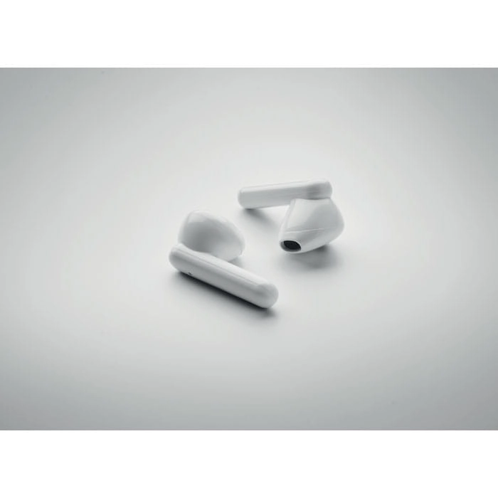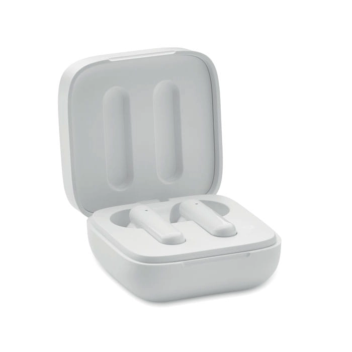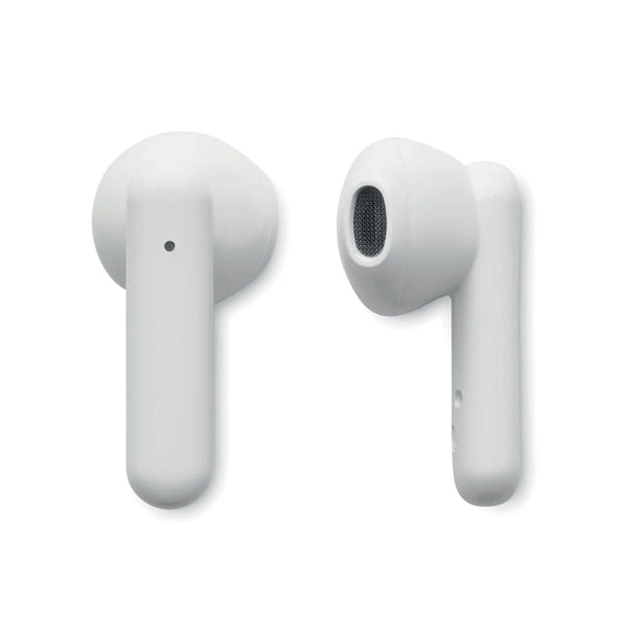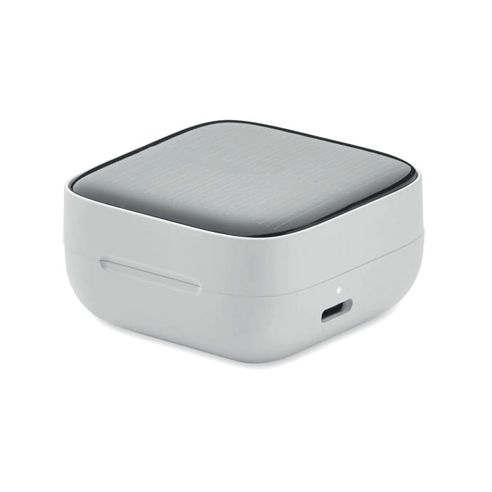 Bezprzewodowe słuchawki douszne ABS True Wireless Stereo (TWS) 5.3 z mikrofonem i akumulatorem 30 mAh. Czas odtwarzania około 4 godzin. Z baterią ładowaną energią słoneczną. Automatyczne parowanie. W zestawie kabel do ładowania typu C i stacja ładująca 200 mAh.