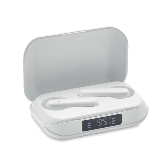 Bezprzewodowe, stereofoniczne słuchawki douszne z ABS z recyklingu True Wireless Stereo (TWS) 5.3 z mikrofonem i wbudowanym akumulatorem 25 mAh. czas odtwarzania ok. 3 godziny. Posiada wyświetlacz LCD poziomu naładowania. Automatyczne parowanie. W zestawie kabel do ładowania typu C oraz stacja ładująca o pojemności 250 mAh.
