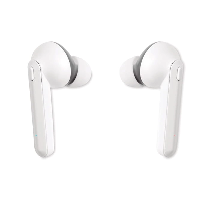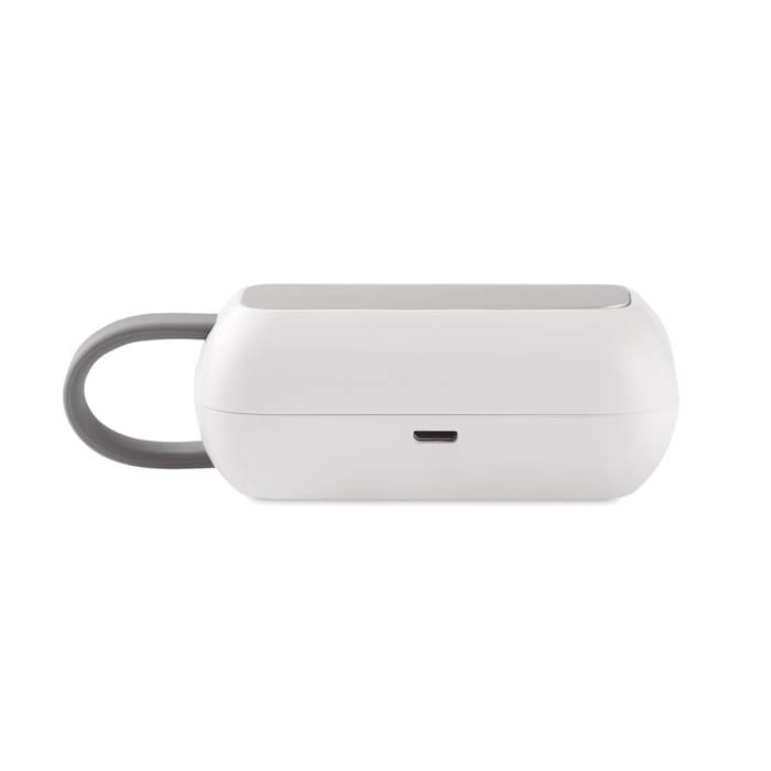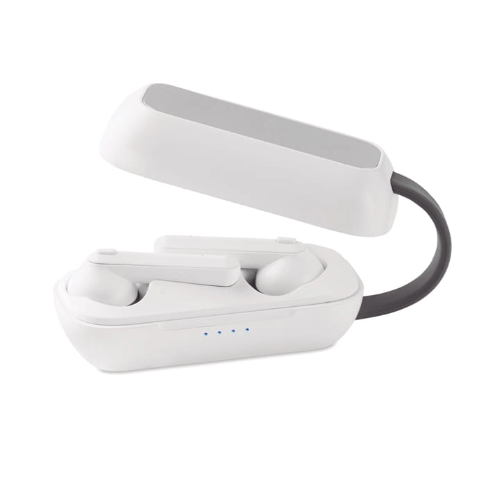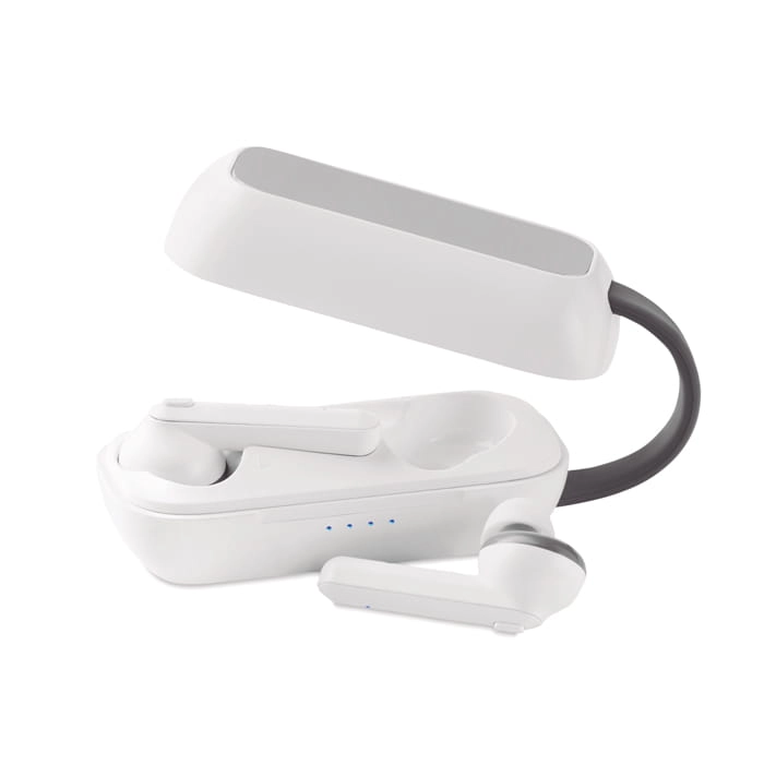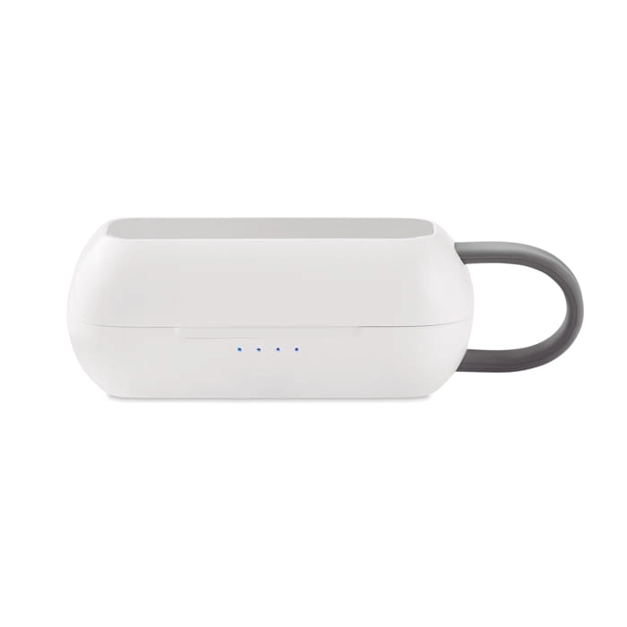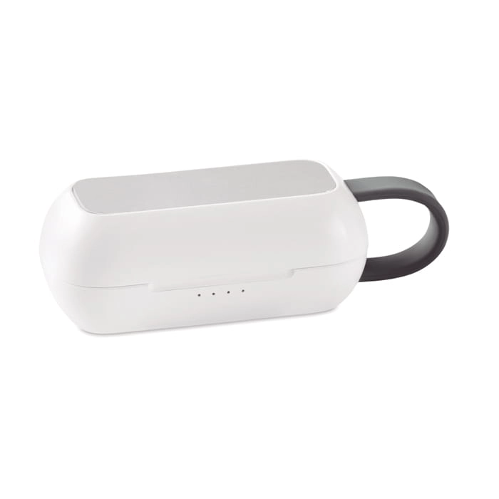 Słuchawki douszne TWS z bezprzewodową bazą ładującą.