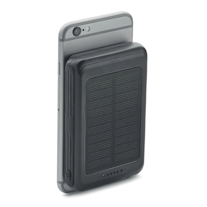 Magnetyczna ładowarka bezprzewodowa (5W) Power bank 5000 mAh z ABS i panel słoneczny. Wyjście: DC 5V/2A. Kompatybilny z iPhone® 12 i nowszymi. W zestawie dodatkowy magnetyczny metalowy pierścień do obsługi ładowania innych niemagnetycznych telefonów z funkcją ładowania bezprzewodowego.