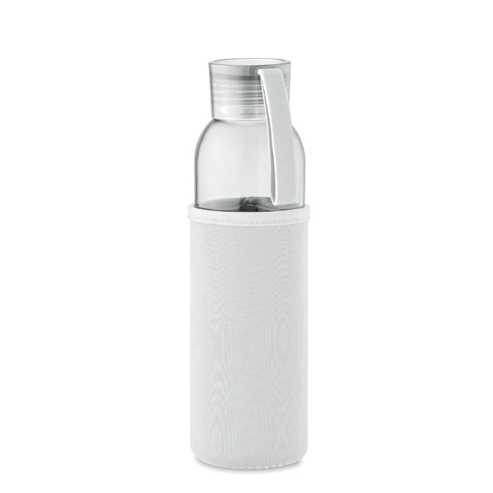 Szklana butelka z recyklingu z neoprenowym etui, z zakrętką z PP i z silikonową zwieszką. Szczelna. Pojemność: 500 ml.