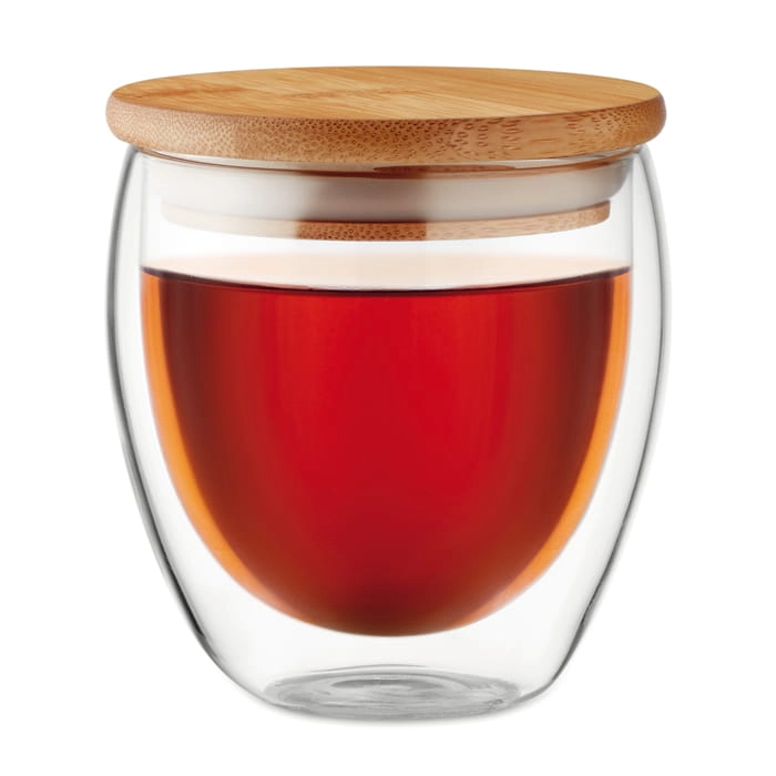 Szklanka z dwuwarstwowego szkła borokrzemianowego z pokrywką bambusową z silikonową uszczelką. Pojemność 250 ml. Bambus jest materiałem naturalnym, jego kolor może się różnić w poszczególnych przypadkach.