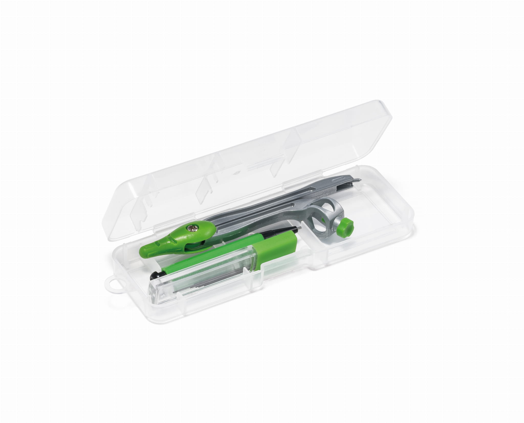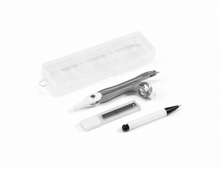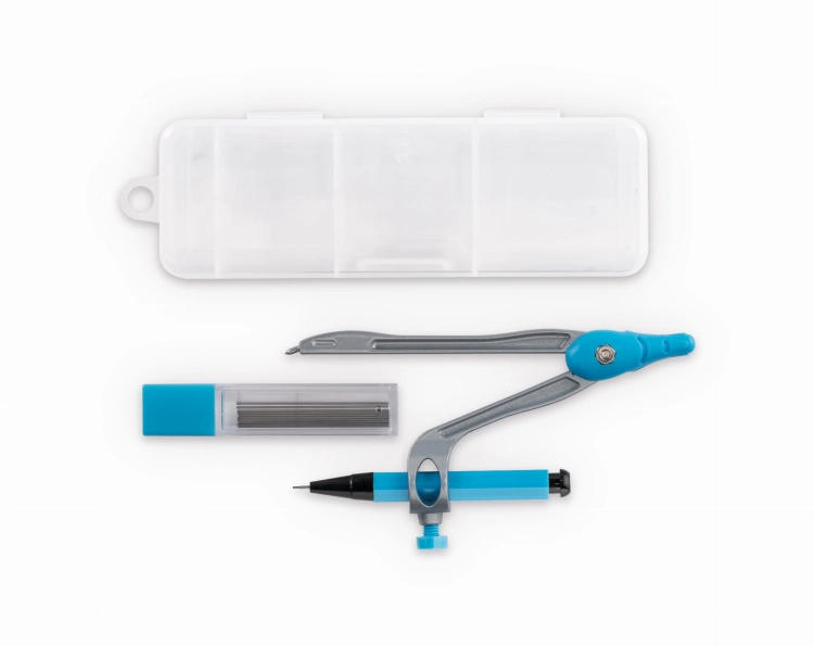 Szkolny zestaw do geometrii. Etui z materiału PP zawiera 3 elelmenty: 1 cyrkiel, 1 ołówek mechaniczny i 10 wkładów 0.5 mm.