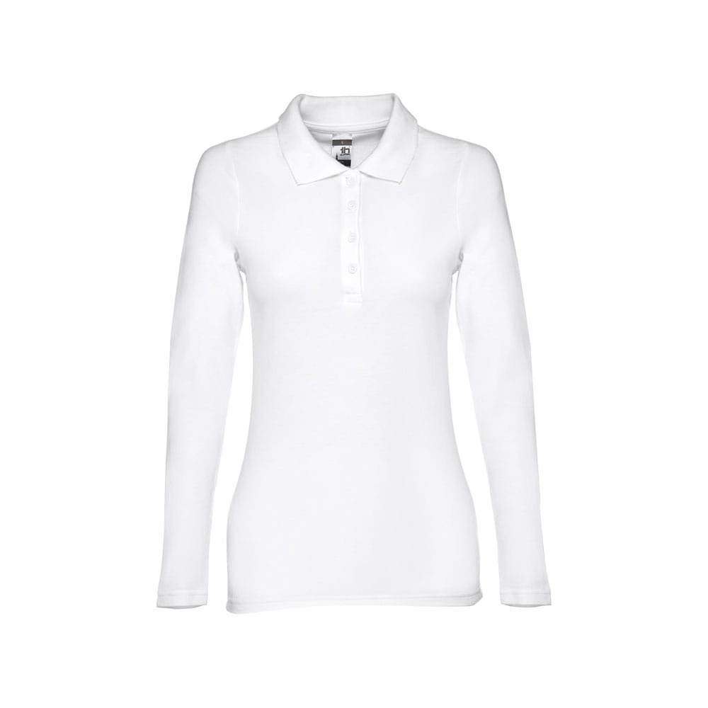 Damski t-shirt polo z długim rękawem ze 100% bawełny o splocie piqué (210 g/m?) ze zgrzebną przędzą bawełnianą. Prążkowany kołnierzyk jest wzmocniony taśmą piqué. Posiada 4 dopasowane kolorystycznie guziki (dodatkowy guzik umieszczony w szwie wewnętrznym). Zszywany po bokach, z podwójnym ściegiem na rękawach. Zdejmowana widoczna etykieta