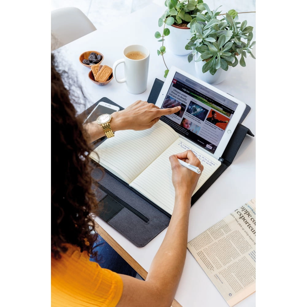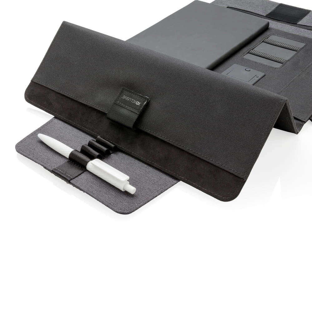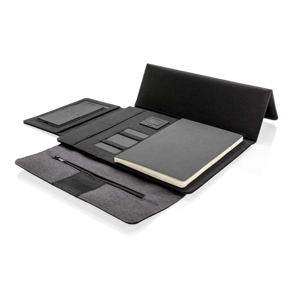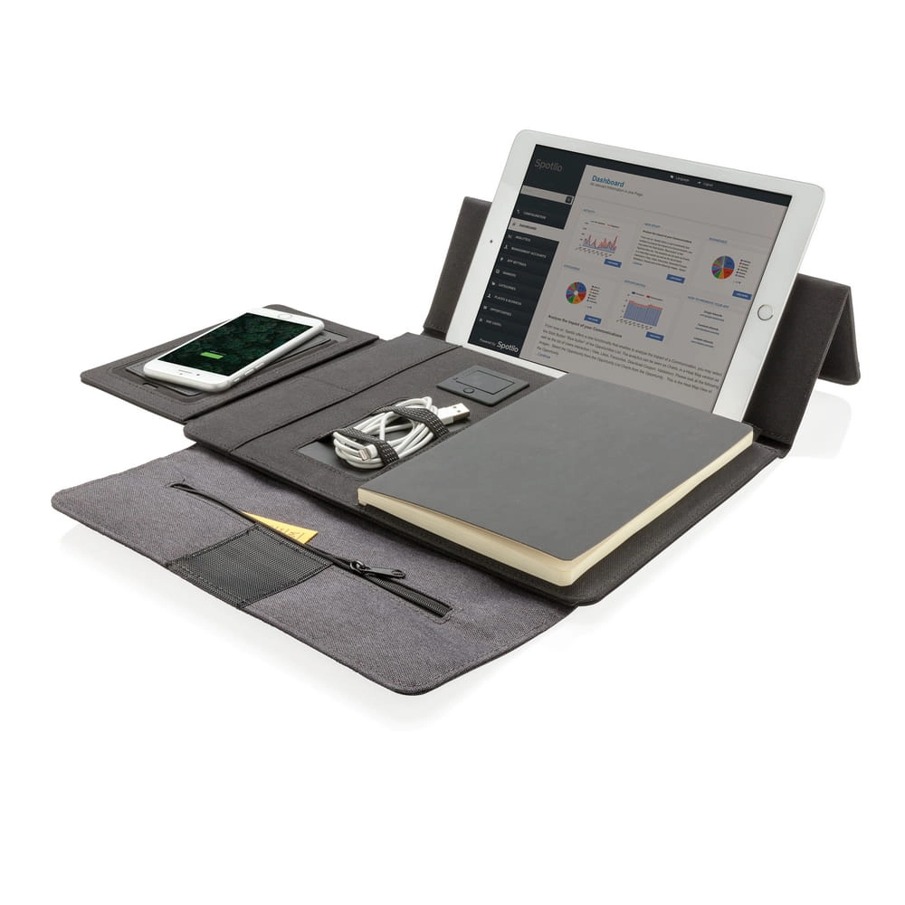 Otwórz teczkę konferencyjną A4 Kyoto i przekonaj się, że w środku zmieści się całe biuro, łącznie z tabletem (który może również stać pionowo). W komplecie bezprzewodowy power bank 4000 mAh. Kompatybilny ze wszystkimi urządzeniami QI, np. najnowszej generacji systemy Android, iPhone 8 (i wyższe). Wejście 5V/1A, wyjście 5V/2.1A, bezprzewodowe wyjście 5W. Produkt wykonany z rPET (recycled PET bottles). Wewnątrz wyjmowany notatnik A5 z 64 kartkami 80 g/m2 w linie w kolorze kremowym. Wzór zastrzeżony®