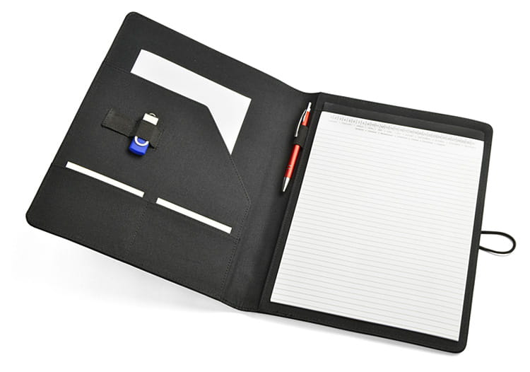 Prosta teczka o nowoczesnym wyglądzie. Zawiera dużą kieszeń, małe kieszonki, 2 miejsca na USB, miejsce na długopis, notes. Teczka zapinana na gumkę zaczepianą o metalowy haczyk.Wykonana z mikrofibry i poliestru. Notes nie jest umocowany na stałe, ale wsuwany w kieszonkę, dzięki czemu można go łatwo wymienić. Logo wygrawerujemy na metalowym haczyku.