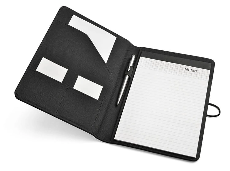 Prosta teczka o nowoczesnym wyglądzie. Zawiera dużą kieszeń, małe kieszonki, miejsce na długopis, notes. Teczka zapinana na gumkę zaczepianą o metalowy haczyk. Wykonana z mikrofibry i poliestru. Notes nie jest umocowany na stałe, ale wsuwany w kieszonkę, dzięki czemu można go łatwo wymienić. Logo wygrawerujemy na metalowym haczyku.