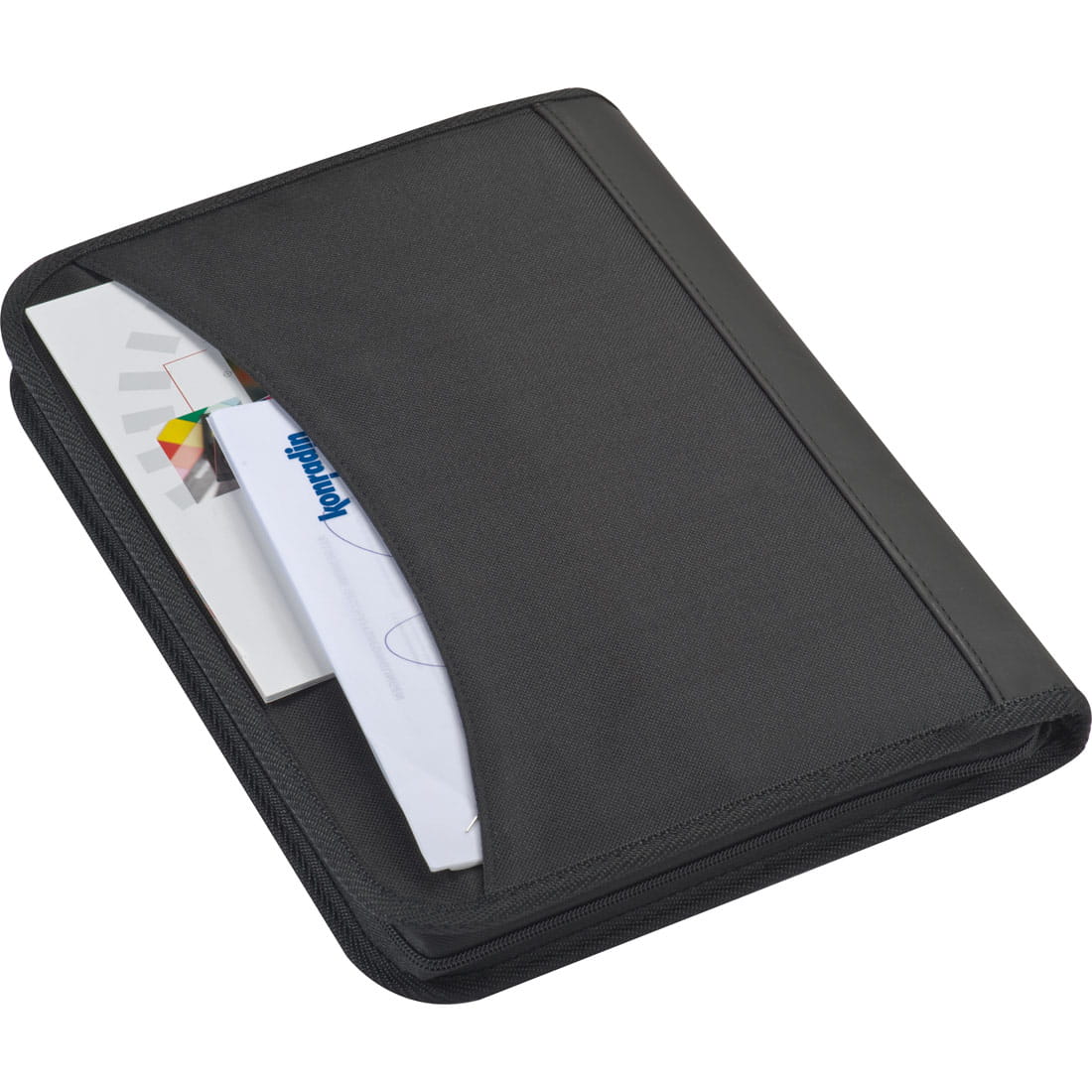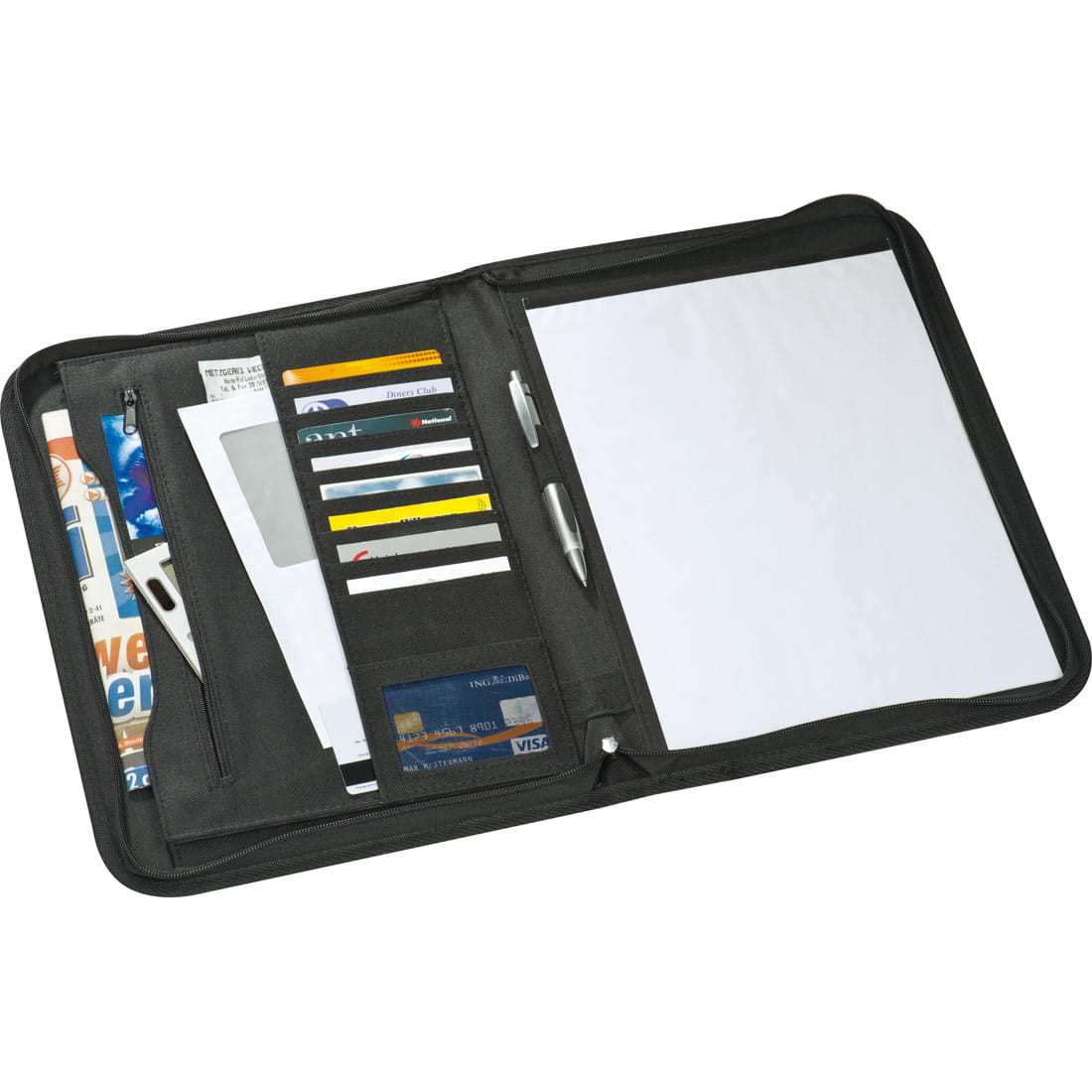 Praktyczna teczka wykonana z poliestru i tworzywa PU, zamykana na zamek. Posiada wiele praktycznych przegródek oraz 10-kartkowy notatnik.