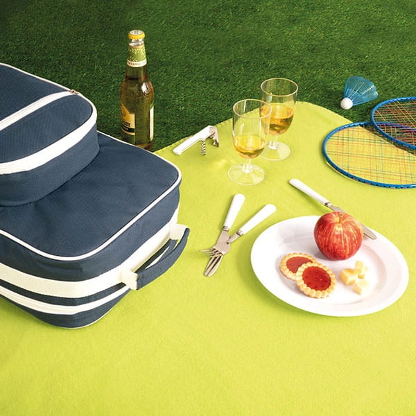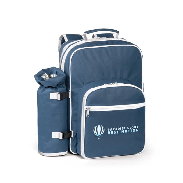 Termiczny plecak piknikowy. 600D. Ze zdejmowaną termiczną torbą na butelkę. Główna komora amortyzowana, z powłoką termiczną. Przednia kieszeń wyłożona 210D i wyściełana. Zawiera 6 sztućców ze stali nierdzewnej (2 widelce, 2 noże i 2 łyżki), 2 talerze, 2 k