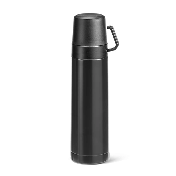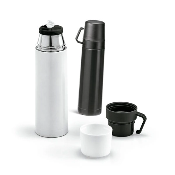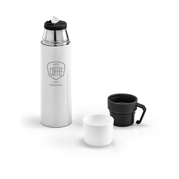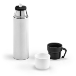 Termos. Stal nierdzewna i polipropylen. Podwójne ścianki korpusu oraz kubka. Pojemność do 490 ml. Dostarczany w pudełku.