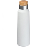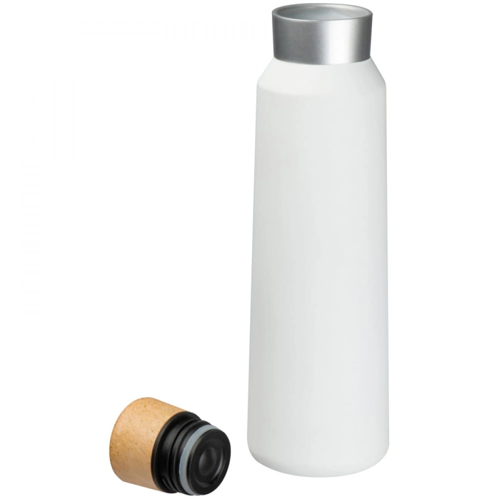 Termos z podwójnymi ściankami wykonany ze stali nierdzewnej, o pojemności 500 ml z drewnianym zamknięciem.