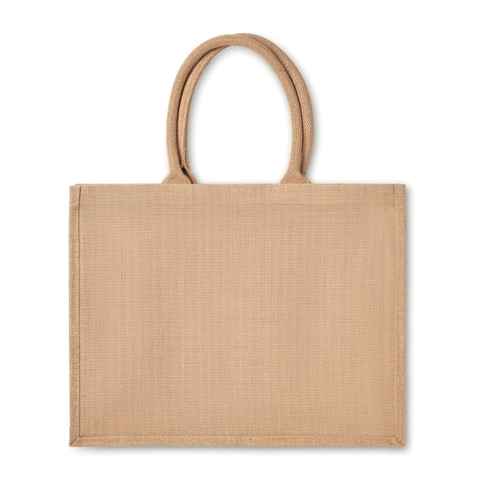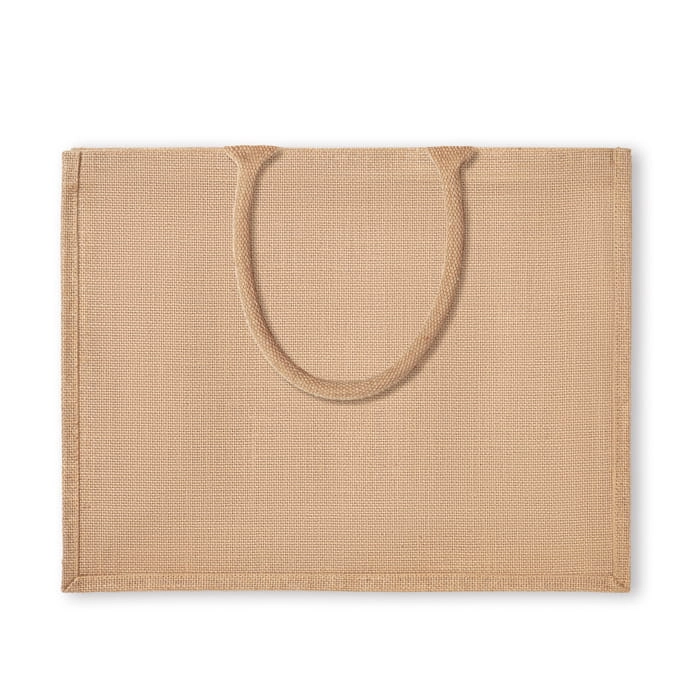 Jutowa laminowana torba na zakupy z krótkimi uchwytami, wykonanymi z bawełny.