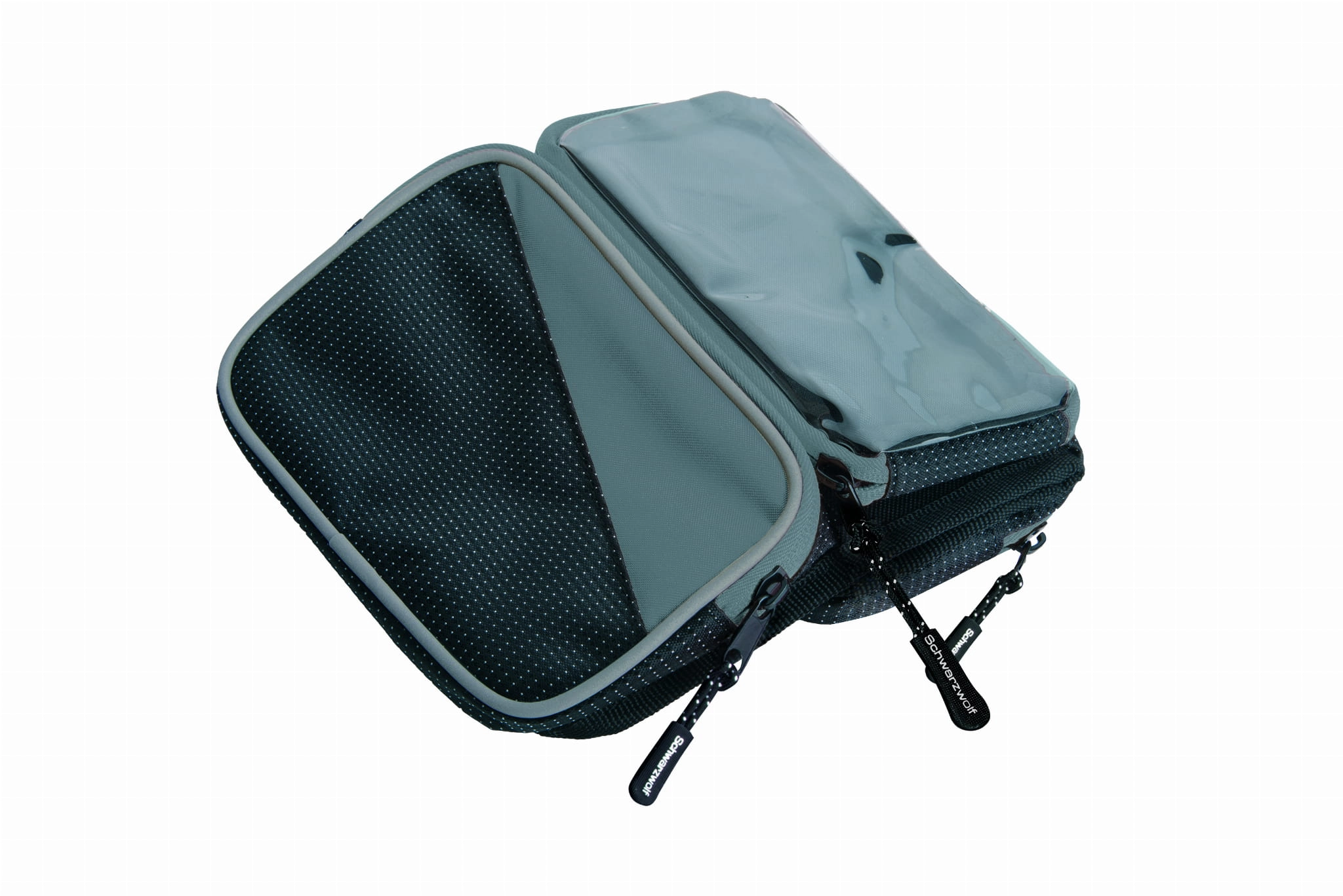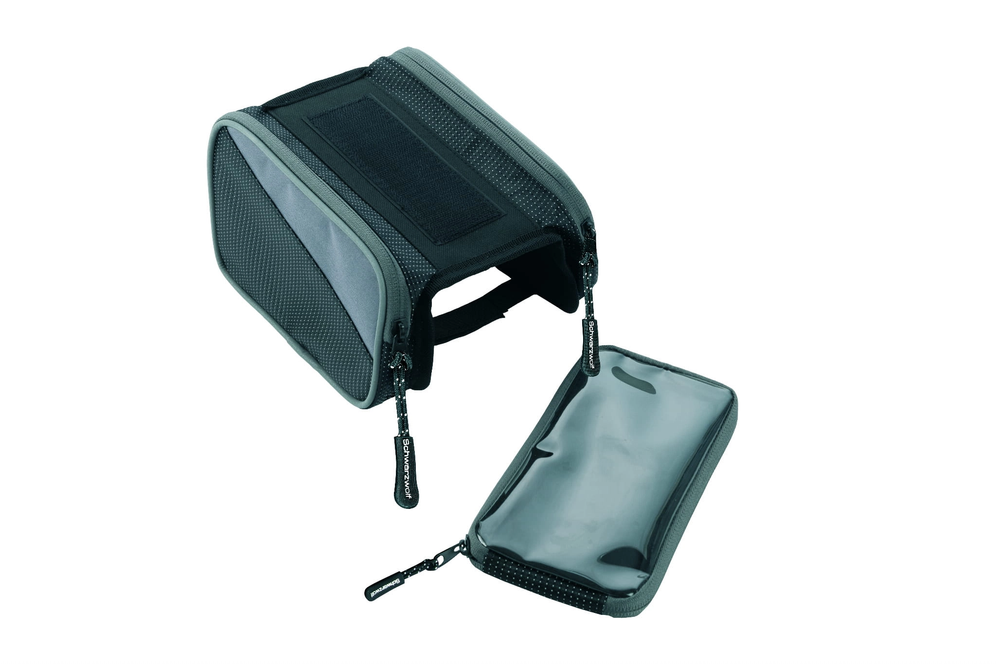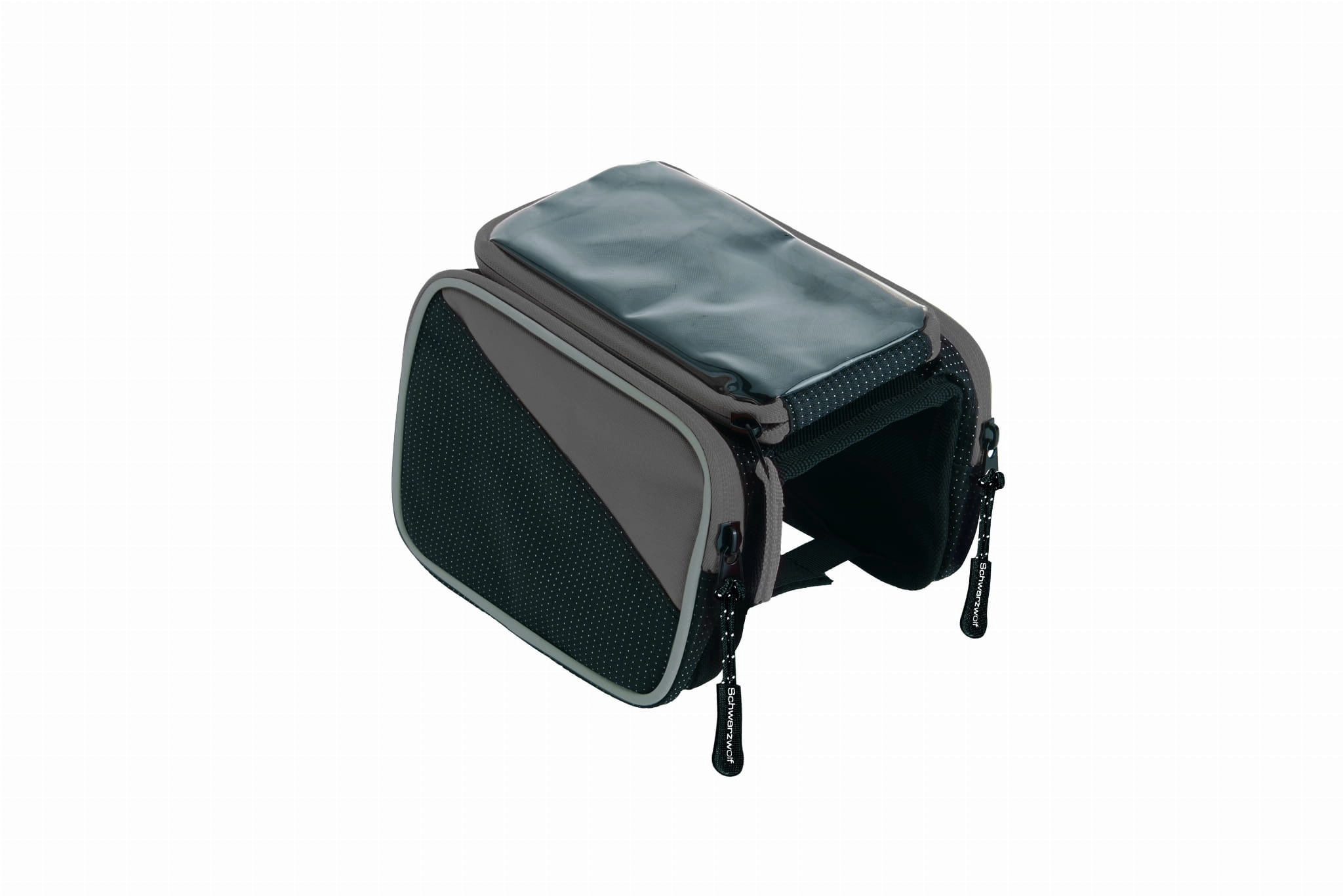 Kompaktowa torba rowerowa Schwarzwolf z kieszenią na telefon. Torba posiada dwie boczne kieszenie z zamkiem oraz przeźroczystą odpinaną kieszeń na telefon. Wymiary wewnętrzne torby: 8 x 16.5 x 2 cm. Pakowana w pudełko Schwarzwolf.