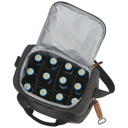 Torba termoizolacyjna Campster na 12 butelek. Część serii Campster Field & Co.®. Inspiracja pochodzi z obozów retro i dawnych skautów, jednocześnie ciekawe połączenie ze współczesnymi trendami. Ta stylowa torba wykonana z połączenia wełny i z akcentami materiału poly i winylu, z funkcją izolowanej chłodziarki, z przedziałkami na butelki. Wkładki oddzielające, wsuwane i tworzące oddzielne przedziałki dla dwunastu poszczególnych butelek 350ml. Gdy nie są w użyciu, można je rozłożyć aby przechowywać je na dnie torby. Zestaw zawiera otwieracz do butelek markowych Field & CO. Połączenie poliestru i wełny.