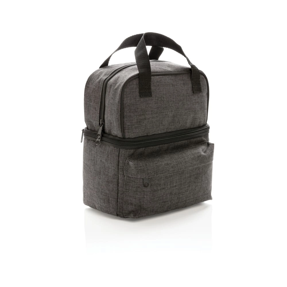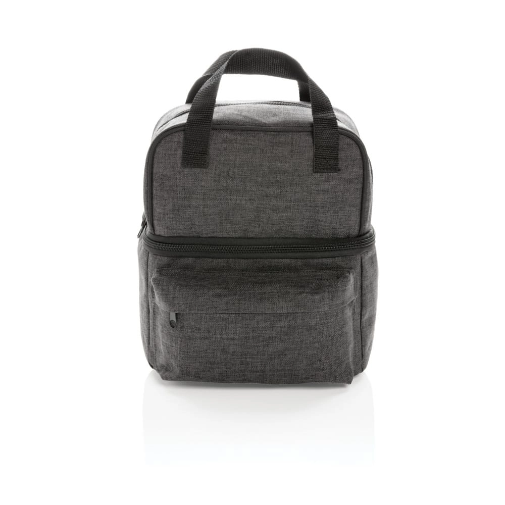 Torba termoizolacyjna z uchwytami i 2 przegrodami, wykonana z poliestru 600D, górna przegroda do owoców i przekąsek oraz dolna przegroda zmieści do 6 puszek 0,33l, przednia kieszeń na zamek błyskawiczny