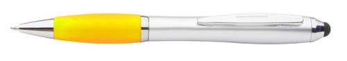 Plastikowy długopis z końcówką do ekranów dotykowych ze srebrnym korpusem i kolorowym, gumowym uchwytem. W zestawie z niebieskim wkładem.