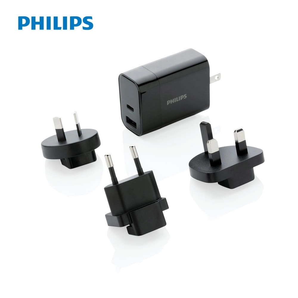 Uniwersalna ładowarka Philips 30W, adapter podróżny, wtyczki z USA, Australii, UK i UE, wejście 100-240V, wyjście USB 5V/2.4A, wyjście typu C 5V/3A, 9V/2A, 12V/1.5A, pokrowiec w komplecie, w ozdobnym pudełku Philips