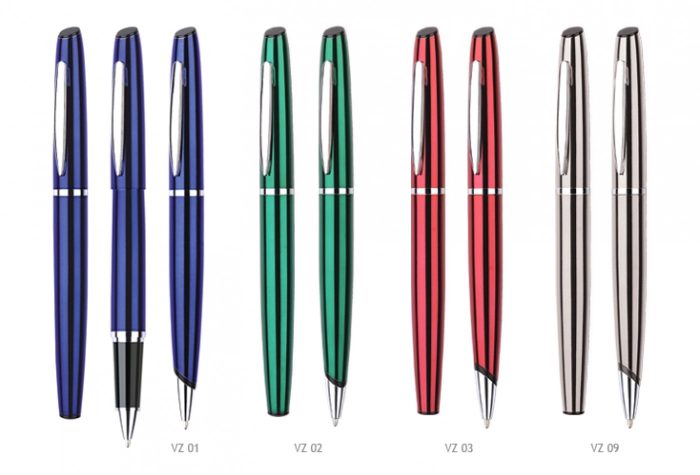 Metalowy komplet składa się z długopisu i pióra kulkowego; korpus pokryty warstwą niklu a następnie polakierowany; klip, końcówka i pierścień -srebrne.