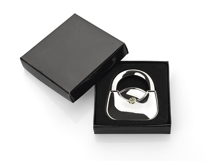 Składany wieszak na torebkę w kształcie damskiej torebki wykonany z metalu. Wieszak ozdobiony szkiełkiem zapewniającym mu elegancki wygląd. Pakowany w czarne pudełeczko. Na powierzchni wieszaka wykonujemy znakowanie grawerem.