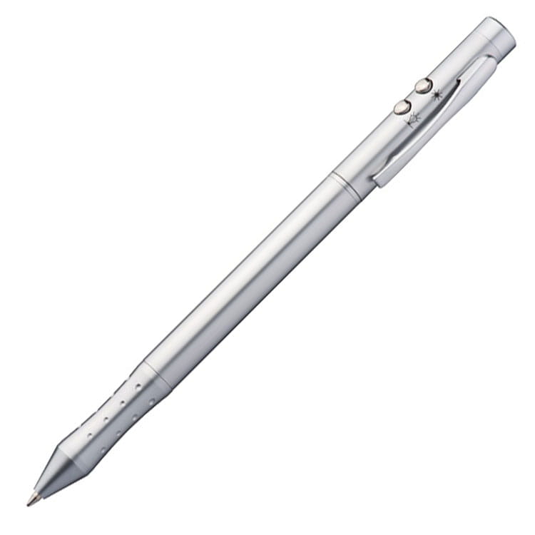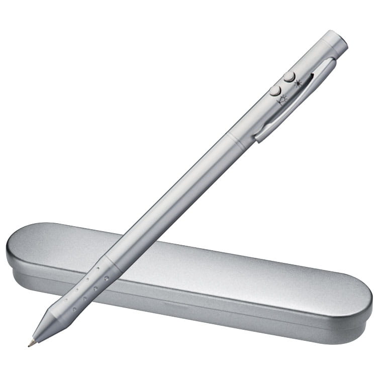 Wskaźnik laserowy 4 w 1. Eleganckie metalowe urządzenie do pisania z długopisem z dwóch stron (niebieski i czerwony), wskaźnikiem laserowym (zgodnym z unijnymi standardami) i lampą LED. Wytrzymały uchwyt zapewnia wygodne pisanie. Trzy baterie i metalowe pudełko są już w zestawie. Pakowany pojedynczo w pudełko. Grupa nadruku: L2.