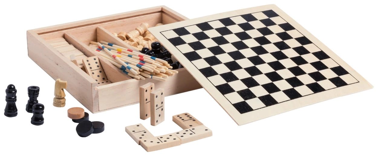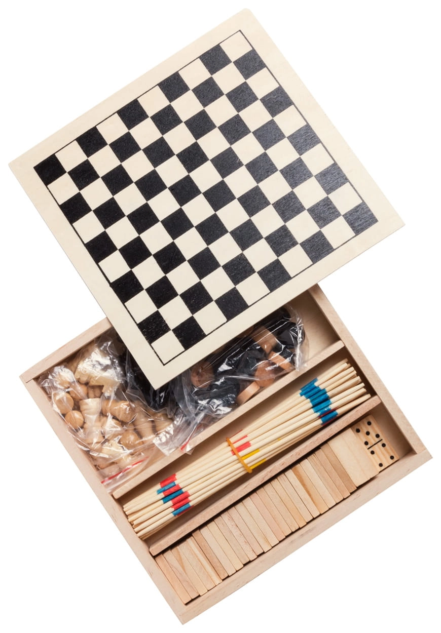 Derwniany zestaw gier zawierający: szachy, domino, mikado i bierki.