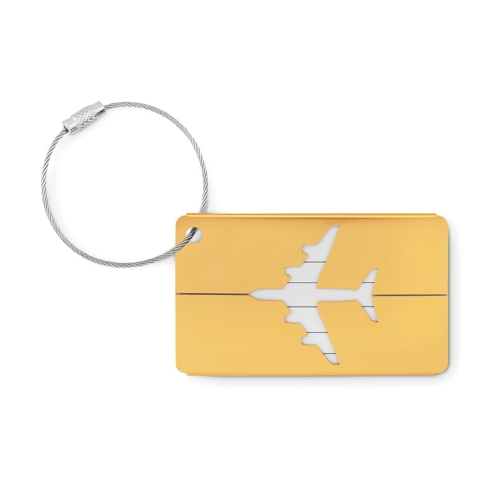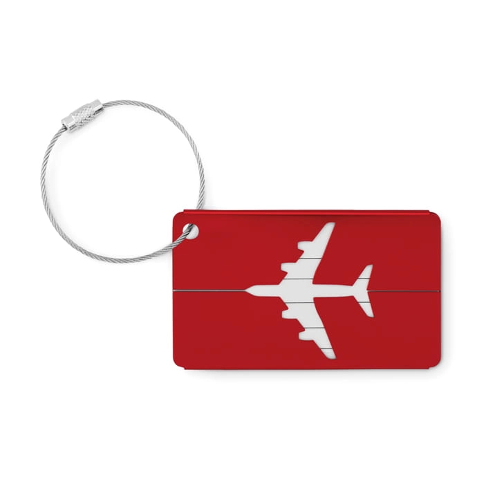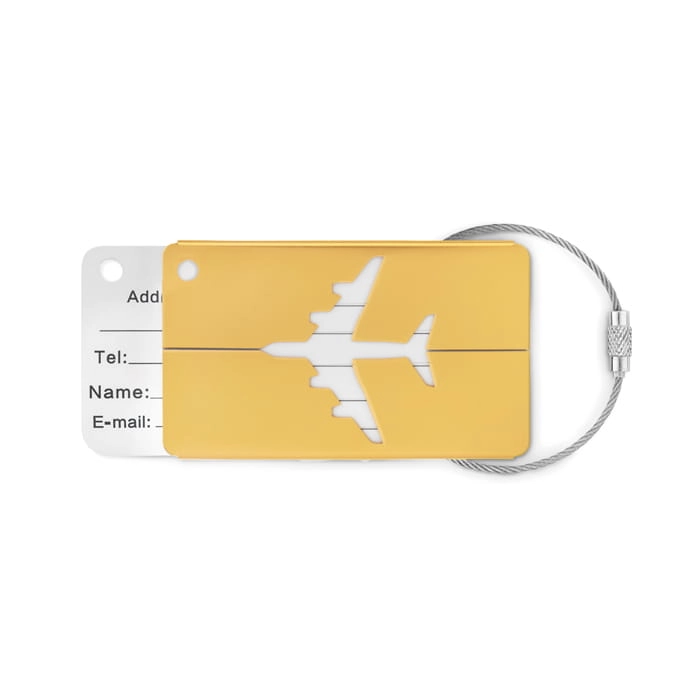 Aluminiowa przywieszka na bagaż lotniczy z etykietą na nazwisko i adres. W komplecie uchwyt.