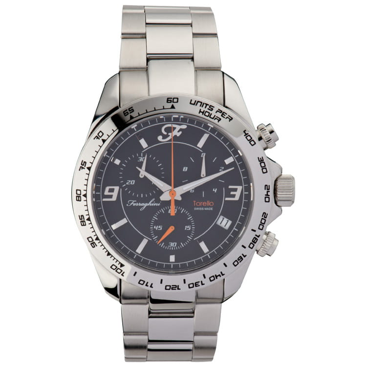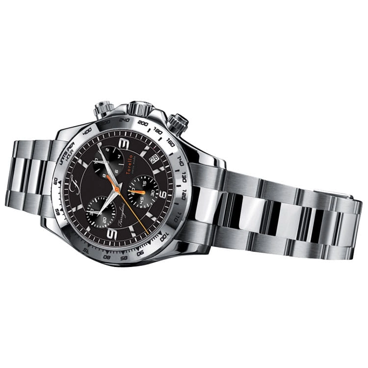 Zegarek TORELLO z mechanizmem kwarcowym. Posiada dużą (42mm.), wykonaną z hipoalergicznej stali nierdzewnej kopertę oraz wiele funkcji: wodoszczelność do 100m. (10ATM), tachometr, stoper oraz wskaźnik daty. Jego tarczę chroni odporne na zarysowania szkiełko szafirowe. Bransoleta, wykonana ze stali nierdzewnej posiada wygodne zamknięcie na zatrzask.