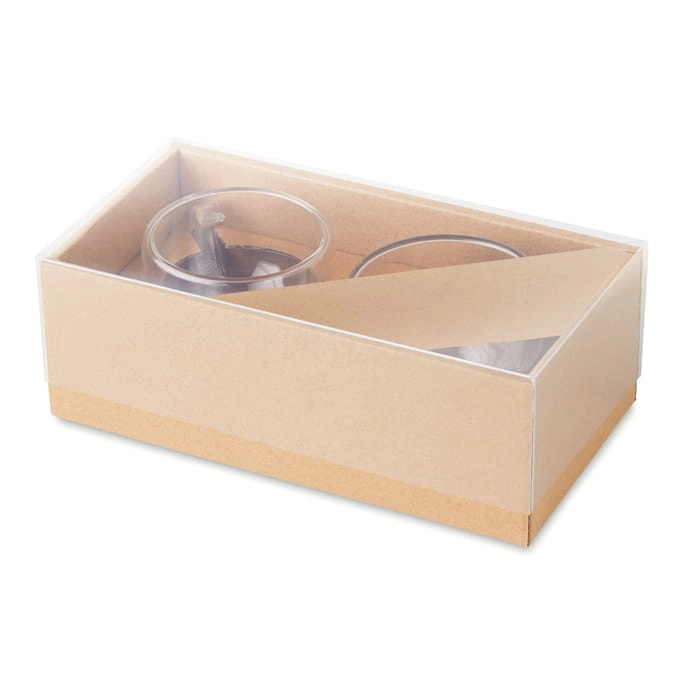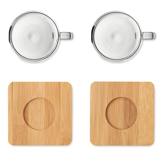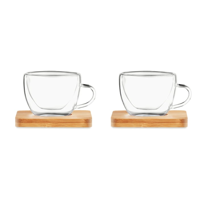 Zestaw 2 szklanek do espresso z podwójną ścianką i bambusowym spodkiem. Pakowany w pudełko papierowe Kraft. Pojemność 90 ml.