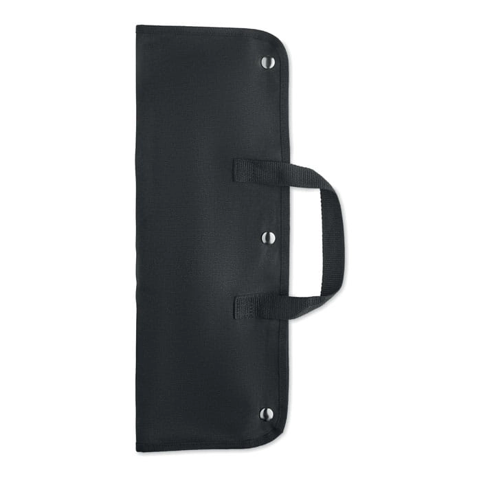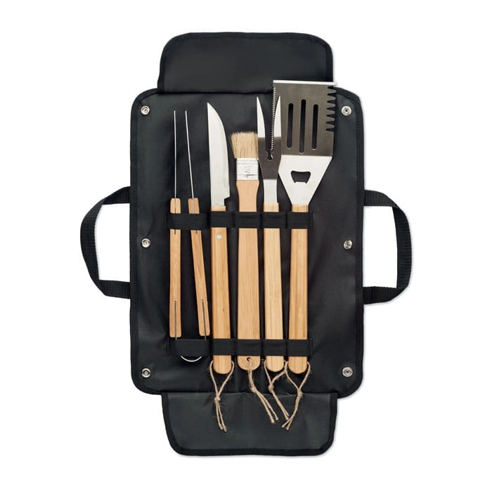 5-częściowy zestaw narzędzi do grillowania ze stali nierdzewnej z bambusowym uchwytem i woskowaną płócienną torbą. Zawiera szpatułkę, nóż, szczypce, widelec i pędzel.