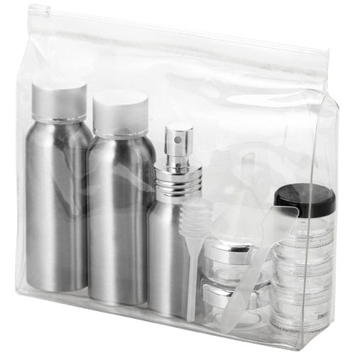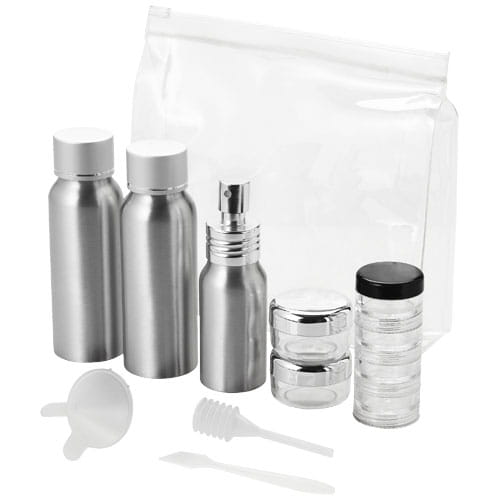 Zestaw butelek aluminiowych do samolotu Frankfurt. Zawiera 2 buteleczki aluminiowe 80 ml, 1 aluminiową buteleczkę z atomizerem, 2 słoiczki 14 ml, 1 czterowarstwowy słoiczek, lejek, szpatułkę i ssawkę. Buteleczki, lejek i reszta akcesoriów zapakowane oddzielnie od etui. Nadruk niemożliwy na poszczególnych elementach. PVC i aluminium.