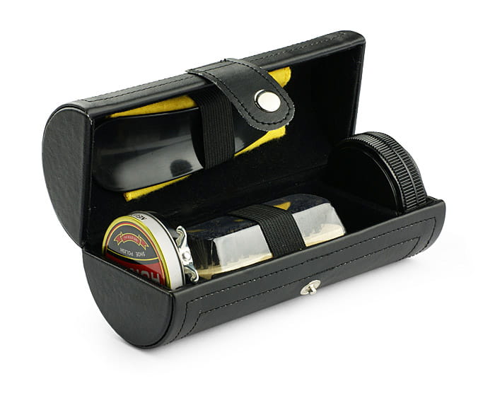 Wszechstronny zestaw do czyszczenia obuwia wykonany z ekoskóry PU. Zawiera pastę bezbarwną, czyścik, łyżkę do butów, ściereczkę i szczotkę. Logo umieścimy na tubie.