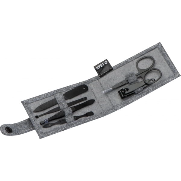 Zestaw do manicure w filcowym etui wykonanym z materiału pochodzącego z recyklingu. Zestaw zawiera nożyczki do paznokci, pilnik do paznokci, cążki do paznokci, pęseta i dwa patyczki do skórek.