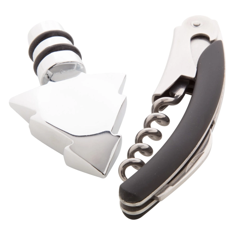 Zestaw do wina z korkociągiem i zatyczką do butelki w kształcie drzewka świątecznego. Zestaw w pudełku prezentowym.