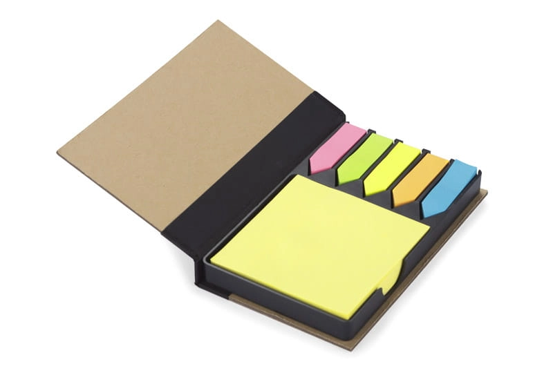 Praktyczny zestaw karteczek na biurko. Zestaw zawiera żółte samoprzylepne karteczki do zapisków a także 5 kolorowych karteczek do zaznaczania. Etui wykonane z bambusa.