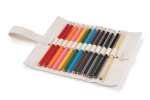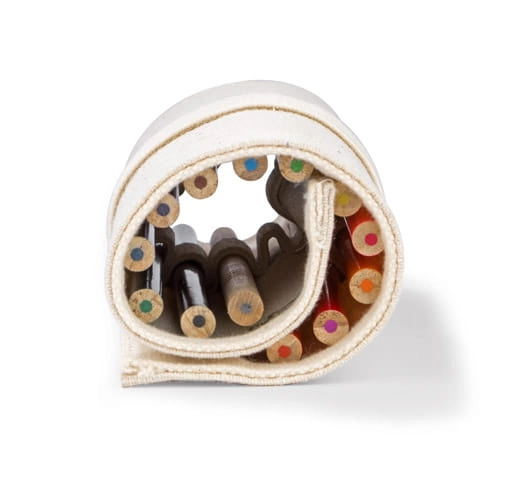 Zestaw kredek został zapakowany w ekologiczne etui wykonane z bawełny. Zamykane jest na gumkę. LABI jest bardzo wygodny w użytkowaniu, jest lekki, co dodatkowo nie obciąży plecaków dzieci. W zestawie znajduje się 12 sztuk kredek i ołówek.