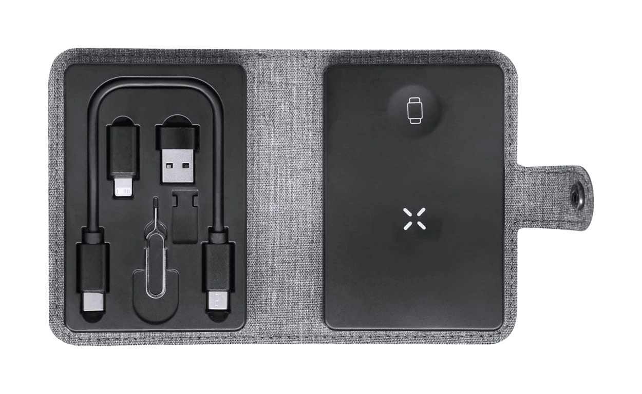 Zestaw ładowarek USB w etui z poliestru 300D RPET. Zawiera indukcyjną ładowarkę (15 W), szpilkę do wysuwania karty SIM i kabel ładowarki USB ze złączami micro USB, USB-C i Lightning. Z wejściami USB i USB-C. Przeznaczony do ładowania smartfonów, słuchawek i smart watch.