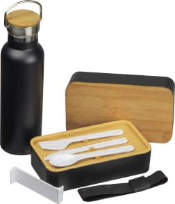 Zestaw zawierający termos wykonany ze stali nierdzewnej i dwupoziomowe pudełko na lunch wykonane z włókien roślinnych.