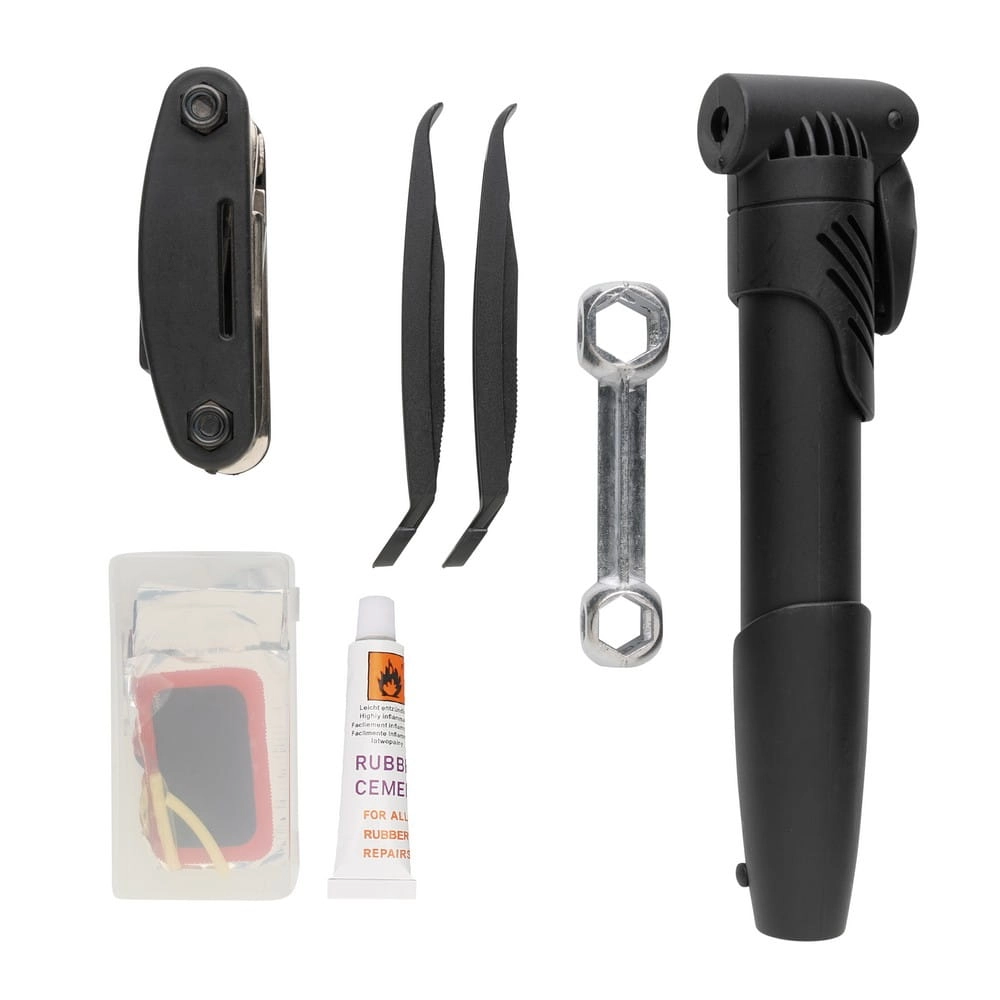 Zestaw naprawczy do roweru w pokrowcu z poliestru 600D, w komplecie: 6 gumowych łatek, tarka z ocynkowanej blachy, 2 rurki z lateksowym zaworem, klej, 2 nylonowe dźwignie, aluminiowy klucz, pompka nylonowa oraz klucz wielofunkcyjny 16 w 1, funkcje: klucze imbusowe 2; 2,5; 4, 5; 6 mm, klucze nasadowe 8; 9; 10 mm, śrubokręt płaski, śrubokręt krzyżakowy, przejściówka przedłużająca, klucze płaskie 8; 10; 15 mm, klucz do szprych 12GE