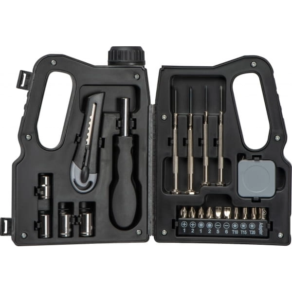 Zestaw narzędzi w etui w kształcie kanistra.