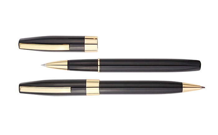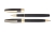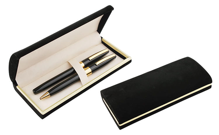 Komplet piśmienniczy ze złotymi wykończeniami pakowany w etui wykonane z eleganckiego czarnego weluru. W komplecie znajduje się długopis oraz pióro kulkowe. Logo wygrawerujemy w kolorze złotym na długopisie i piórze kulkowym w ich górnej części.