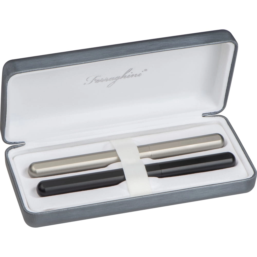 Nowoczesny zestaw do pisania od Feraghinni. Wewnątrz etui znajduje się pióro wieczne oraz pióro kulkowe, wykonane z aluminium.