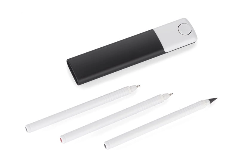 HOP to praktyczny zestaw piśmienniczy zawierający niezbędne akcesoria zapakowane w innowacyjne etui z tworzywa sztucznego. Długopisy umieszczone wewnątrz trzymane są przez specjalny mechanizm, który uniemożliwia ich wypadanie. Naciśnięcie przycisku znajdującego się na dole etui zwalnia blokadę i umożliwia wyjęcie długopisów. W zestawie znajduje się długopis w kolorze niebieskim, długopis w kolorze czerwonym oraz ołówek wieczny niewymagający temperowania. Całość wykonana została z tworzywa sztucznego, dzięki czemu zestaw jest niezwykle lekki. HOP to idealny prezent dla nauczycieli, studentów i uczniów, który zmieści się w każdej torebce i plecaku