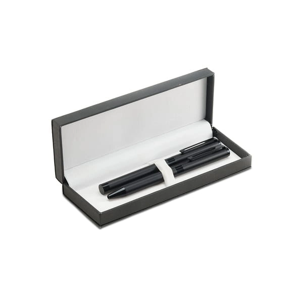 Zestaw piśmienniczy składający się długopisu i pióra kulkowego w upominkowym etui. Wkłady w kolorze niebieskim.