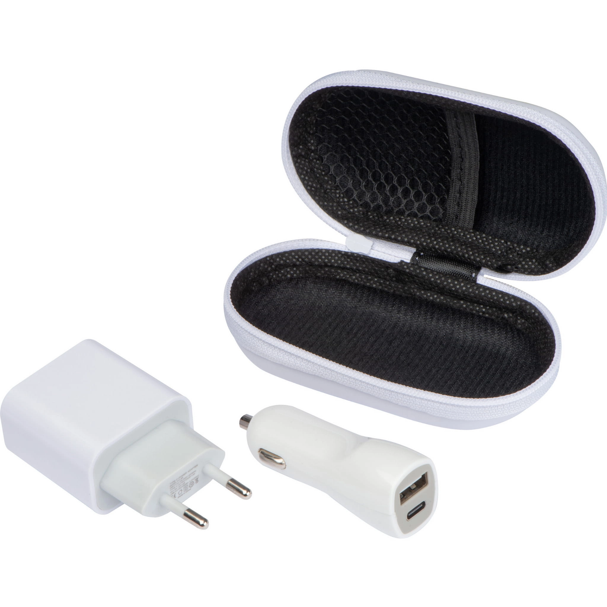 Zestaw podróżny składający się z jednej ładowarki z adapterem USB i wtyczką sieciową UE, praktycznie zapakowany w eleganckie etui.