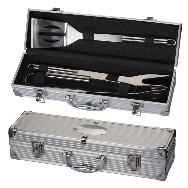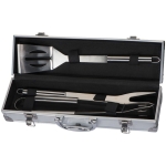 Zestaw metalowych sztućców do grilla, zawierający szczypce do obracania mięsa, łopatkę oraz widelec. Całość umieszczona w metalowej skrzynce, na której można umieścić logotyp.