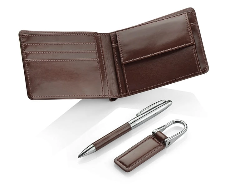 Komplet upominkowy zawierający portfel, brelok oraz metalowy długopis. Portfel wykonany z ekoskóry zawiera 2 przegródki na banknoty, kieszeń na bilon oraz dodatkowe kieszenie na karty kredytowe czy paragony. Całość zapakowana w eleganckie czarne pudełko. Grawerujemy na każdym elemencie lub na pudełku.