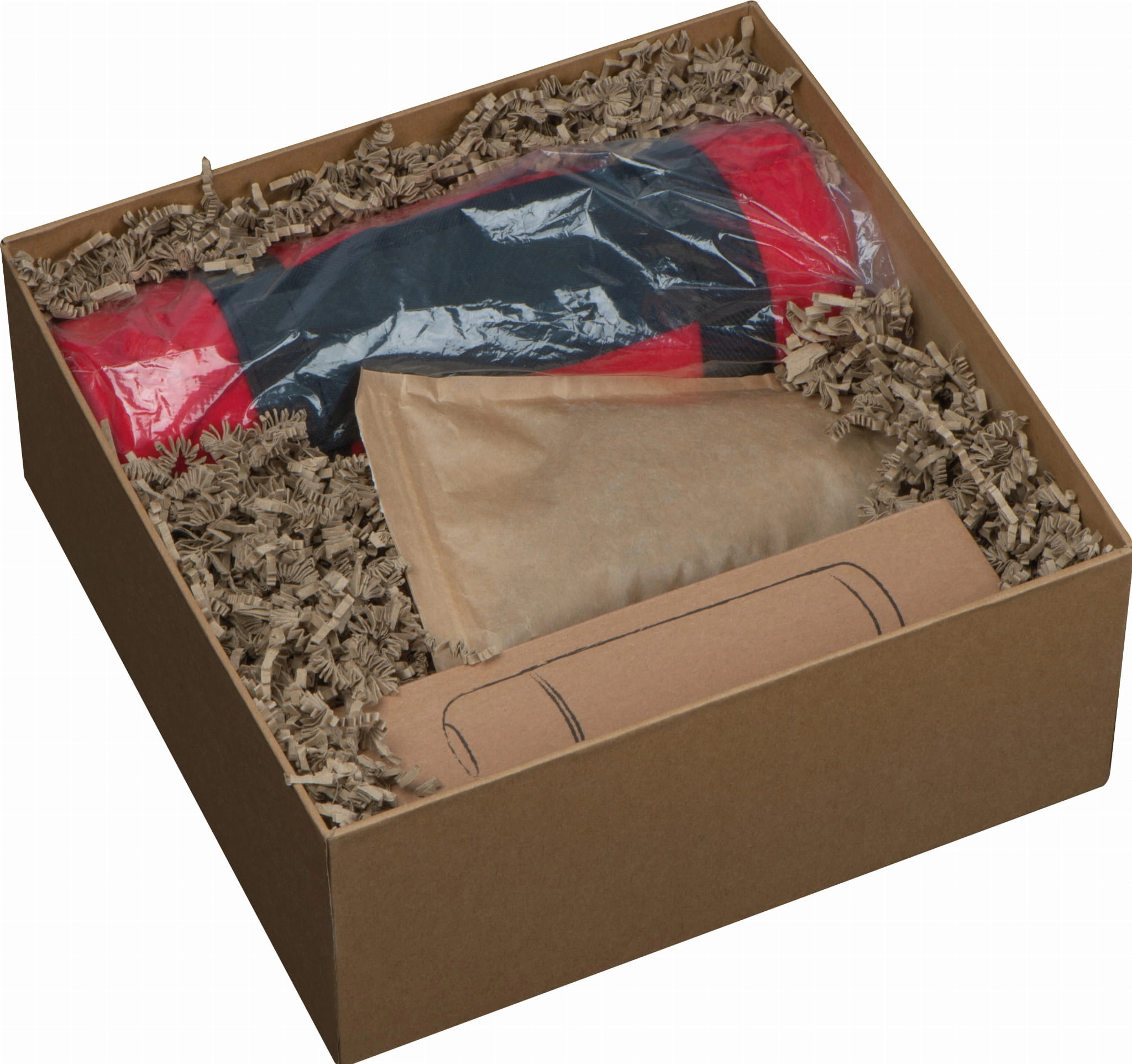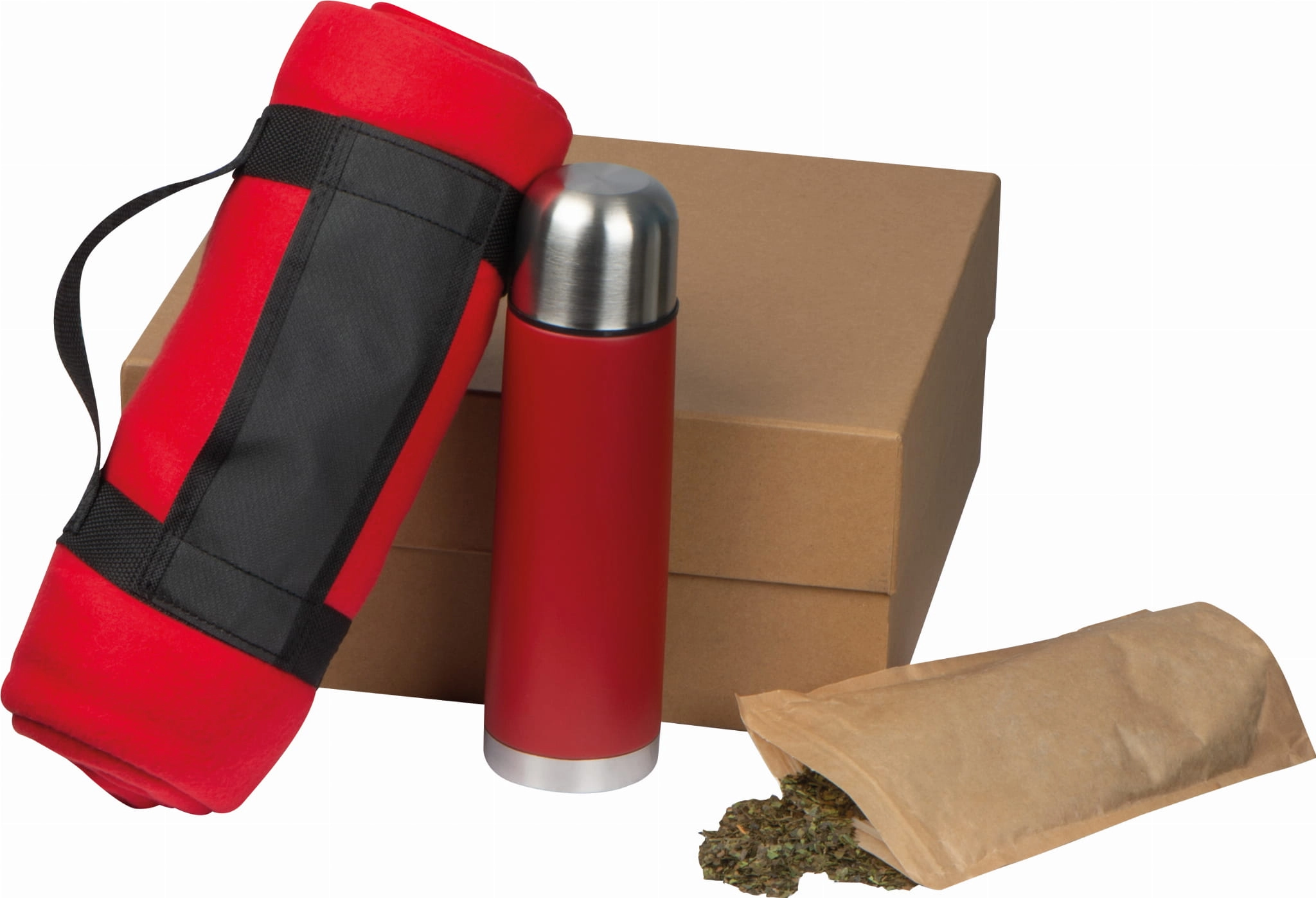 Zetaw upominkowy zawierający czerwony kocyk z polaru (180 x 120 cm), metalowy termos (500 ml) i opakowanie herbaty Earl Grey.